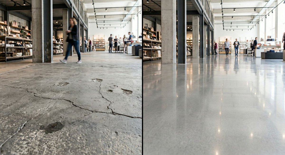 Before polishing, unsealed commercial concrete absorbs oil, brake fluid, and chemical spills on contact. Maintenance teams spend significant labor trying to clean stained surfaces. After polishing to a medium or high gloss, the densified surface resists penetration. Food production, distribution, and showroom clients consistently report a noticeable drop in cleaning time within the first quarter of use.