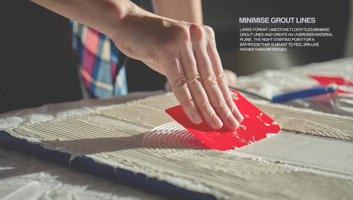 A primary bathroom styled around limestone might look like this: 18-inch square honed tiles on the main floor in a close-matched ivory grout. Shower walls in 12-by-24 rectangles, set vertically to read as full-height cladding.